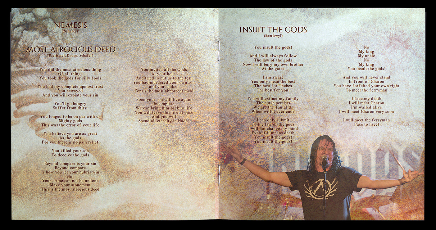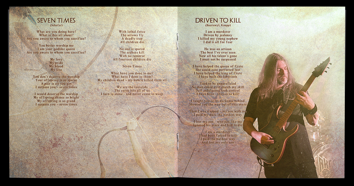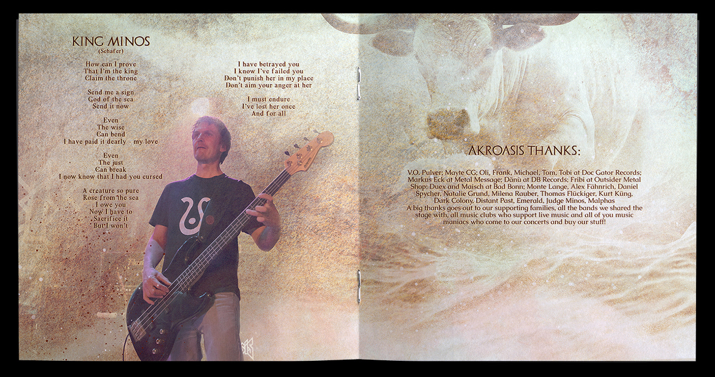 After finishing the external designs, the last step was to create the booklet for the digipak edition and the lyrics sheet for the vinyl. I maintained the stone-like look & feel and combined band member photos provided by Akroasis with subtle visuals that reflected the lyrics.