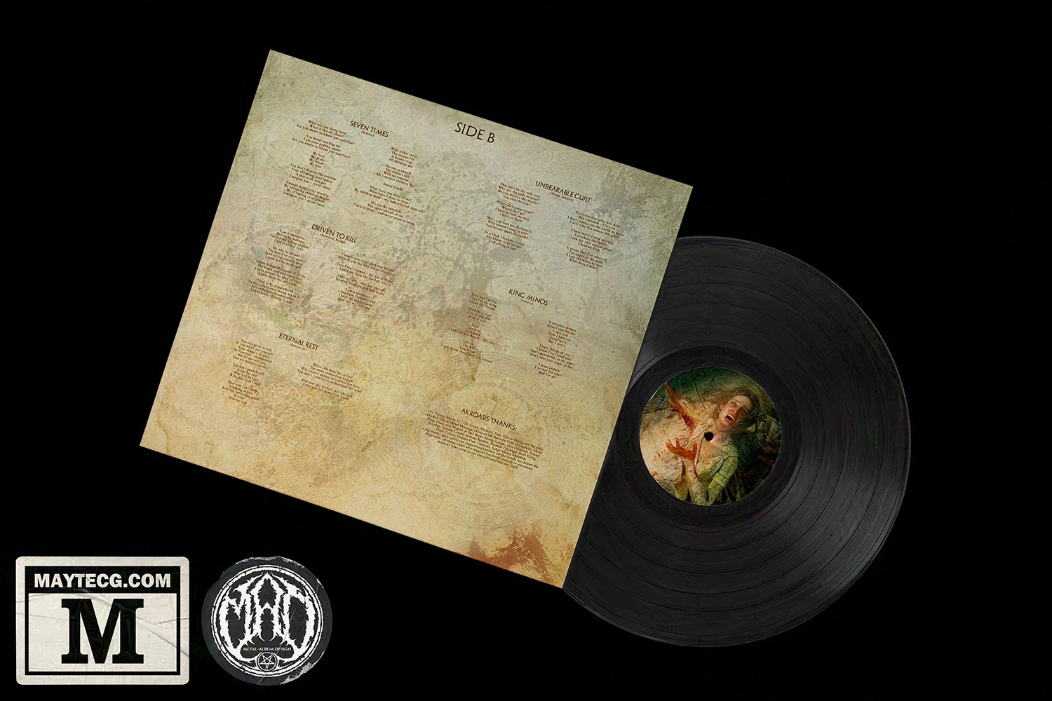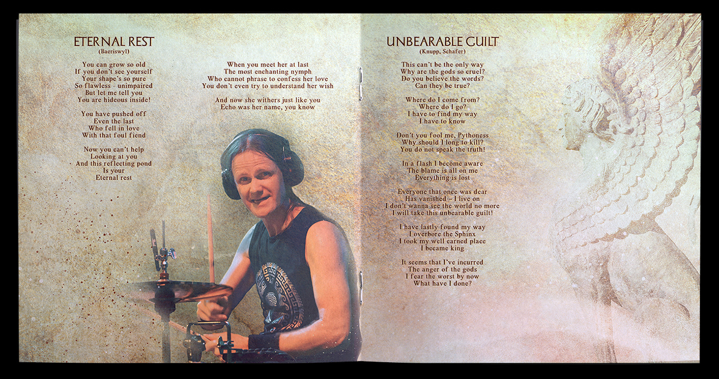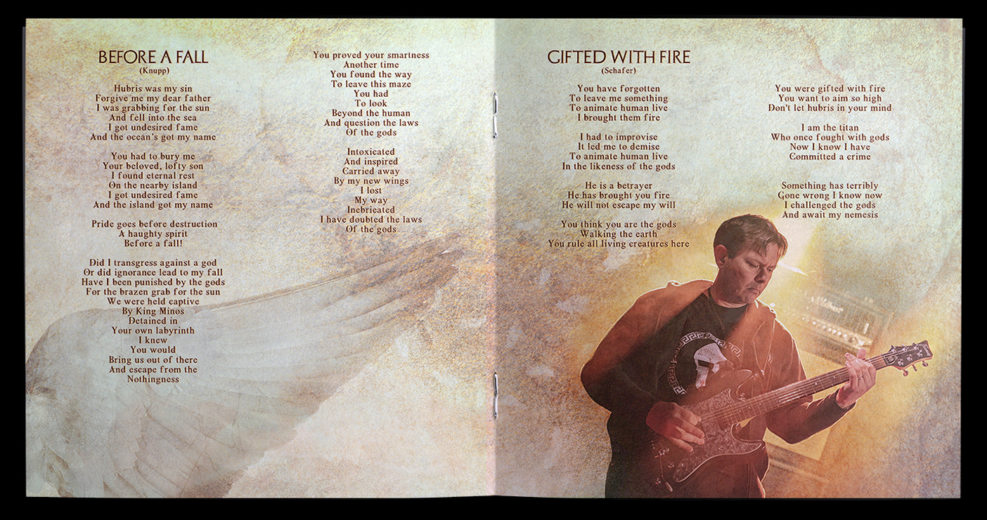 After finishing the external designs, the last step was to create the booklet for the digipak edition and the lyrics sheet for the vinyl. I maintained the stone-like look & feel and combined band member photos provided by Akroasis with subtle visuals that reflected the lyrics.