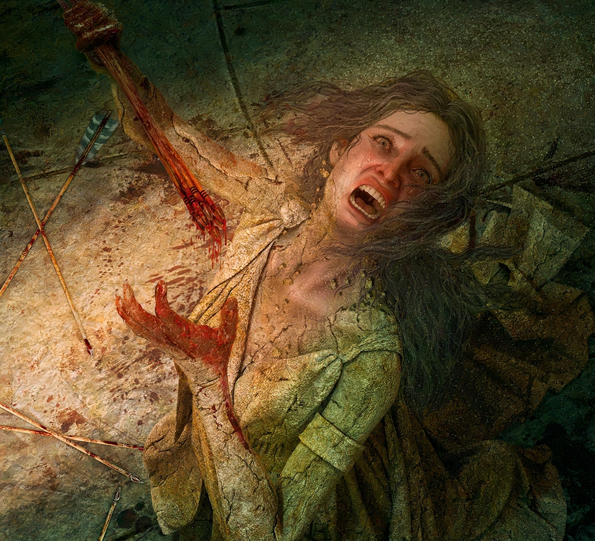 The inner pieces continue the topic of the key art, playing with the arrows and stone concept for the rear inlay and CD label and highlighting Niobe in the left panel.